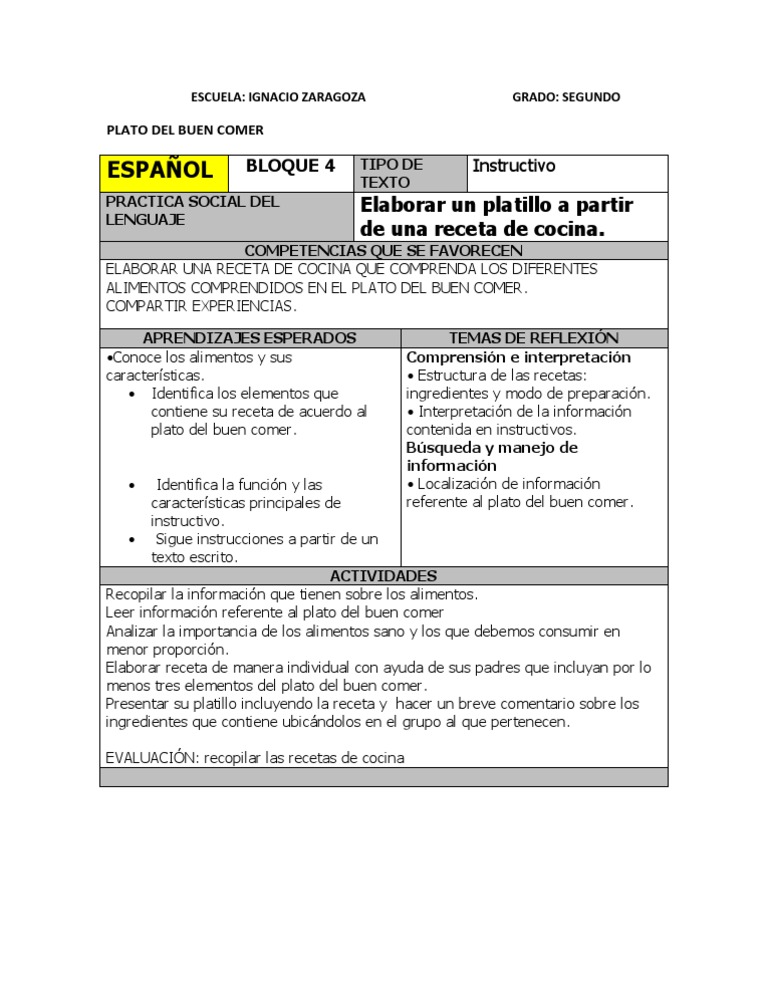Elaborar un platillo a partir de una receta de cocina. La educación para la salud. Plato del buen comer.